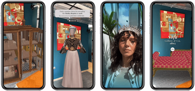 For the V&A, we curated a range of effects exploring different curatorial departments within the museum's collections. Users can engage with a variety of AR experiences, including discovering a miniature replica of the Bettiscombe Dolls’ House, mixing and matching traditional English dresses for a catwalk in the V&A Raphael room, and transforming into iconic theatrical and movie characters like Cleopatra and Elphaba from Wicked.